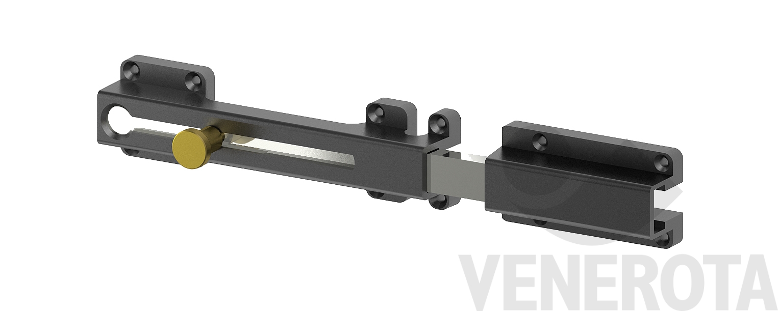 Barra antintrusione con catenaccio integrato, progettata per permettere l’apertura in sicurezza di scuri e persiane con apertura a giorno.