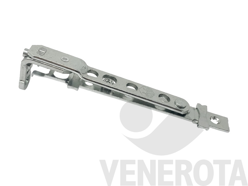 Braccio cerniera A-B Maico in appoggio, con doppia tazza e senza cava ferramenta, completo di distanziatore, pensato per serramenti ad anta battente. Per ante con peso superiore ai 100 kg, è consigliato l'impiego di una prolunga frontale.