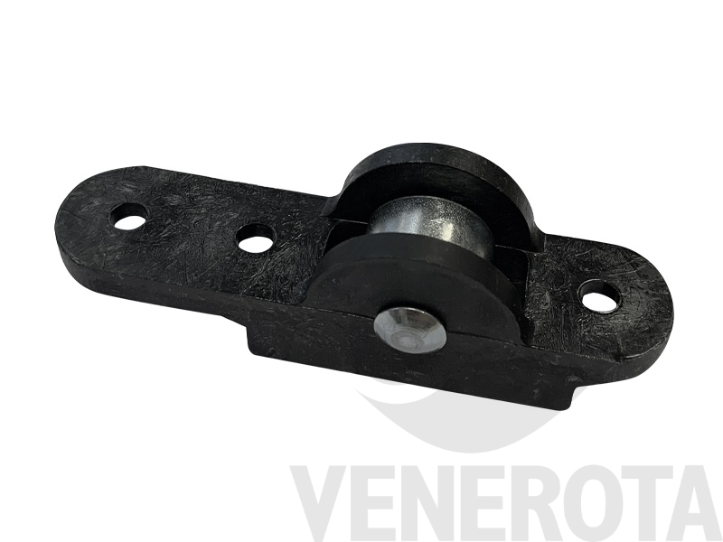 Forcella in acciaio con doppia oliva, pensata per l'installazione su binari di persiane scorrevoli.