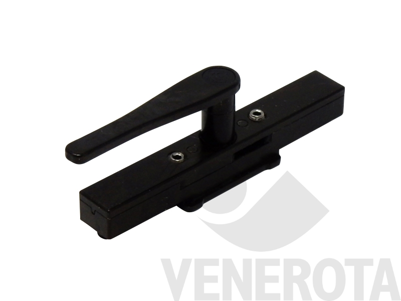 Catenaccio a leva bidirezionale per anta affiancata. Movimentazione e puntali in zama, compensatori in delrin, viti in acciaio inox.