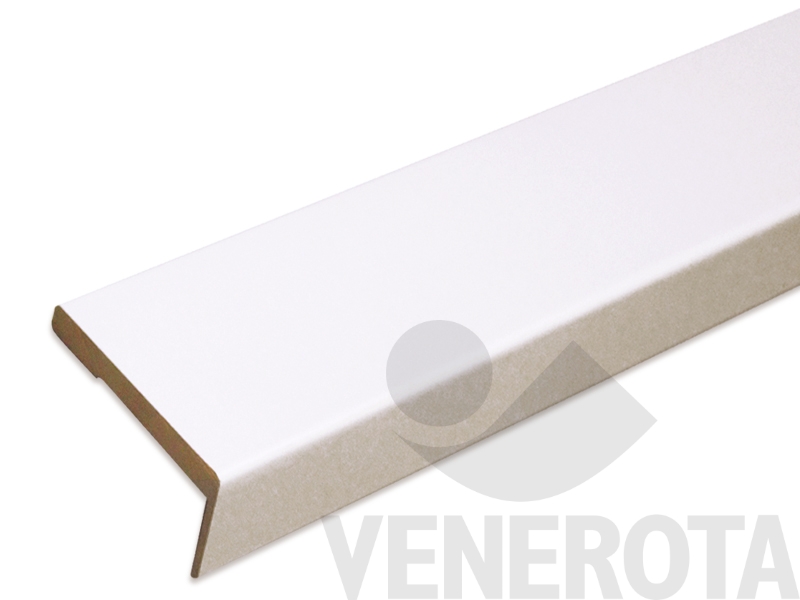 Coprifilo in legno multistrato con aletta maggiorata, colore laminatino bianco per porte interne, dimensione 85x10 mm.