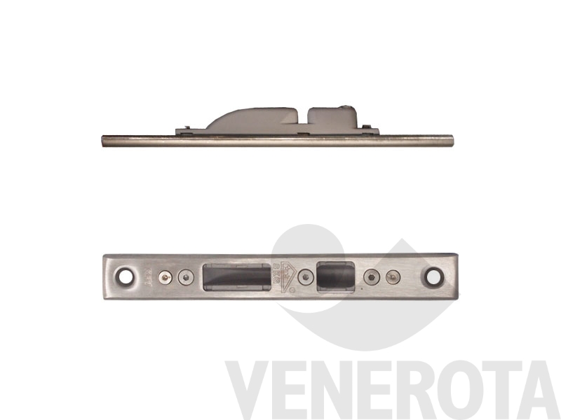 Serratura multipunto a comando cilindro per porte in alluminio, con chiusura in tre punti tramite gancio e punzone. Ideale come ricambio per serrature obsolete o usurate.