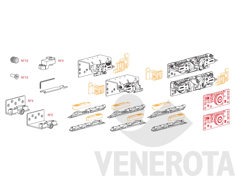 Kit biammortizzato K1052 Ternoscorrevoli per armadi con ante in legno sovrapposte con spessore 28 mm, da utilizzare con binario superiore Comfort 2960 e binario inferiore Comfort 1936 Ternoscorrevoli.