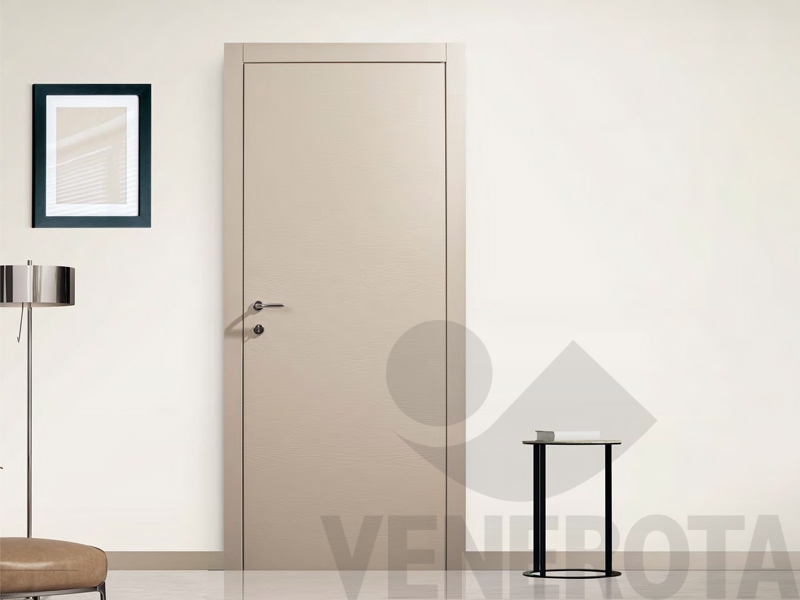 Porta per interni con anta laccata opaca, stipite e coprifilo in finitura opaca, battuta reversibile, cerniere a scomparsa, serratura magnetica silenziosa.