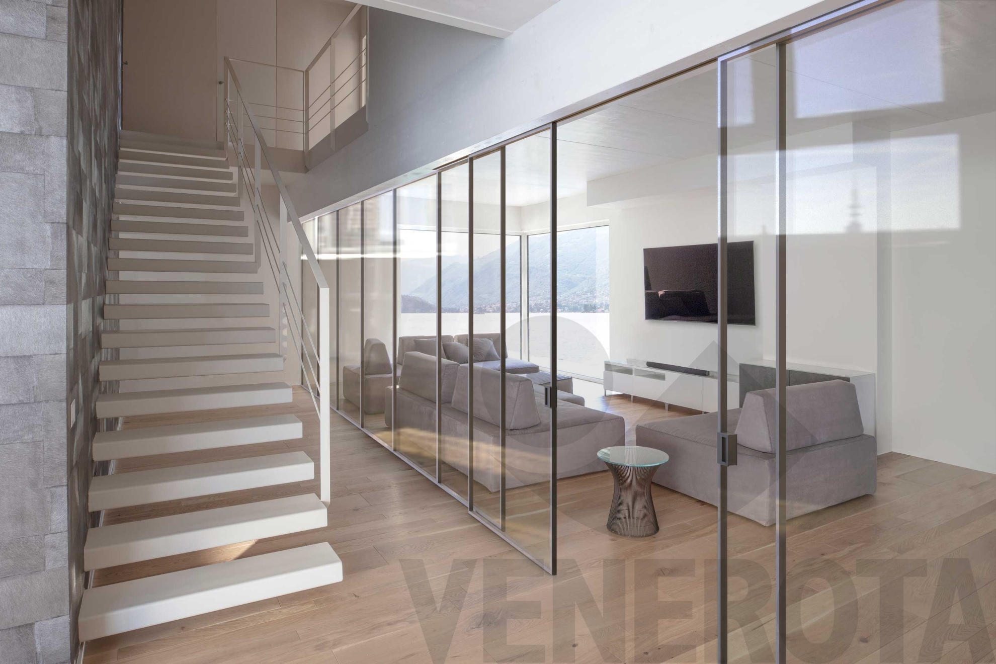La linea di porte Como è progettata per suddividere gli spazi con la leggerezza e la trasparenza del vetro, armonizzandosi con l'alluminio per dar vita a raffinate sovrapposizioni materiche. I riflessi brillanti del vetro evocano i giochi di luce del lago di Como al tramonto, racchiusi in una sottile cornice di alluminio che definisce lo spazio in modo discreto.