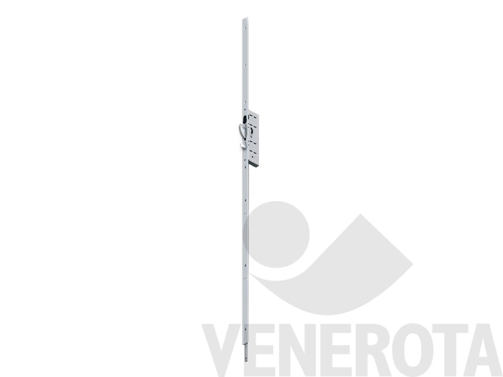 Serratura multipunto per porte in legno con comando a cilindro, dotata di sistema di bloccaggio a tre punti tramite punzone nella parte superiore e inferiore.