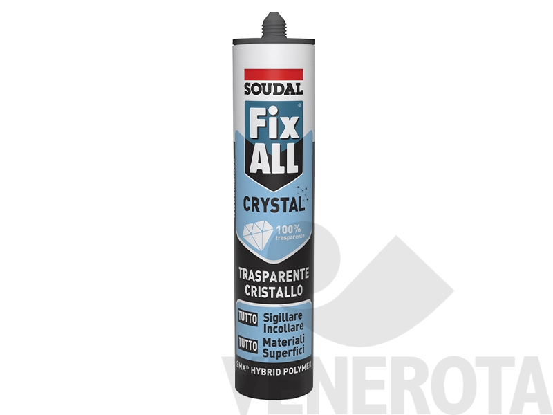 Sigillante adesivo Fix ALL Crystal Soudal a base di polimero MS ideale per applicazioni sia interne che esterne, permette di eseguire incollaggi elastici in diverse applicazioni edili e sigillature di vetri, dove è richiesta elevata trasparenza.